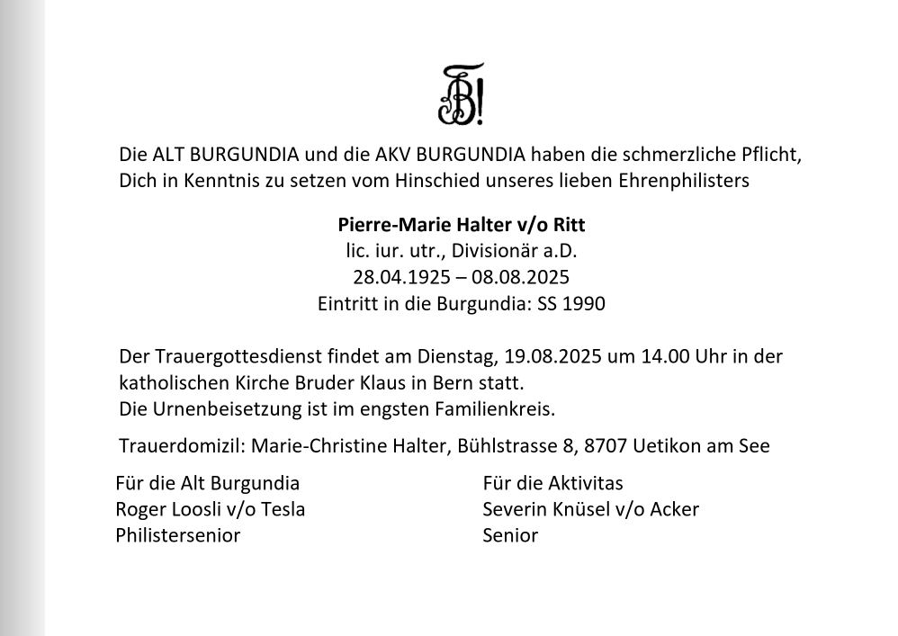 Unser lieber AH Pierre-Marie Halter v/o Ritt ist am 8. August 2025 verstorben.