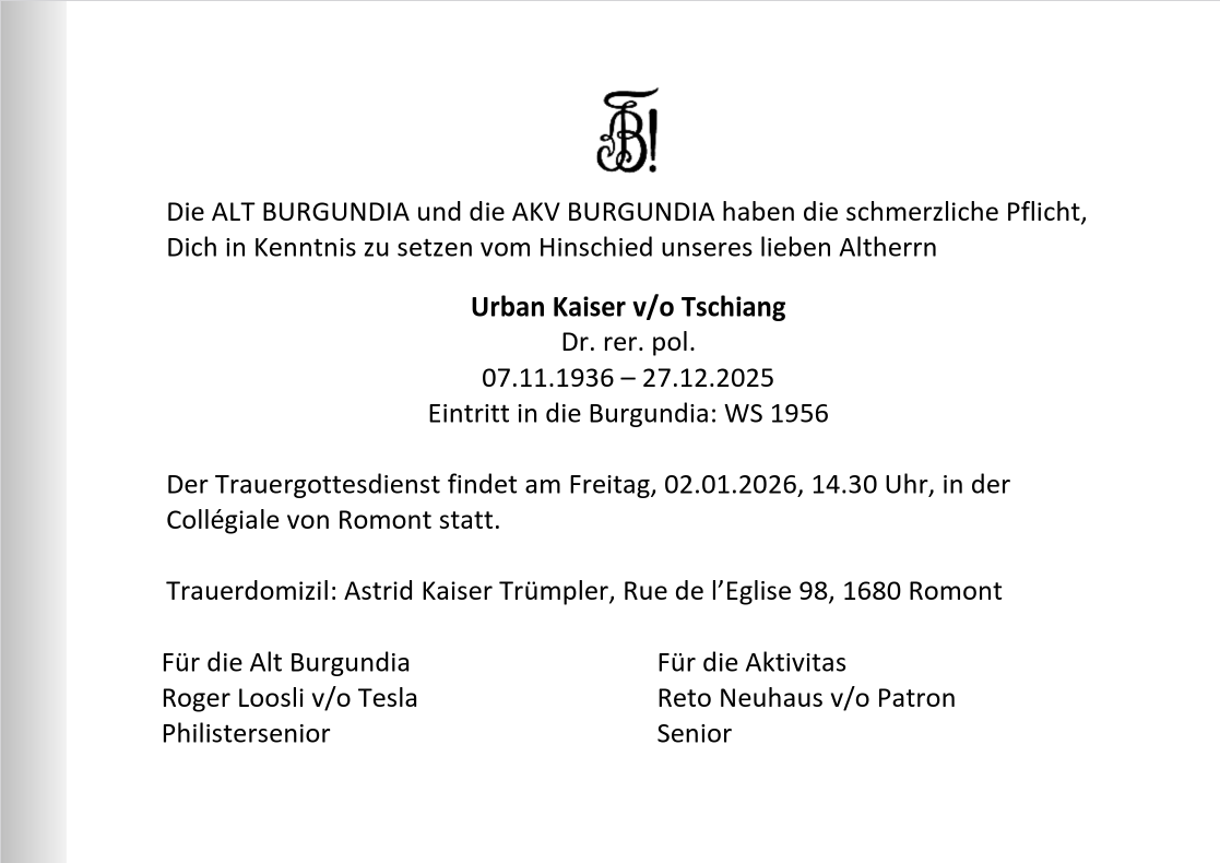 29. Dezember 2025 von netzmeister Beitrag kommentieren RIP Tschiang (1936-2025) Unser lieber AH Urban Kaiser v/o Tschiang ist am 27. Dezember 2025 verstorben. Der Trauergottesdienst findet am Freitag, 2. Januar 2026, 14:30 Uhr, in der Collégiale von Romont statt. RIP Tschiang (1936-2025)