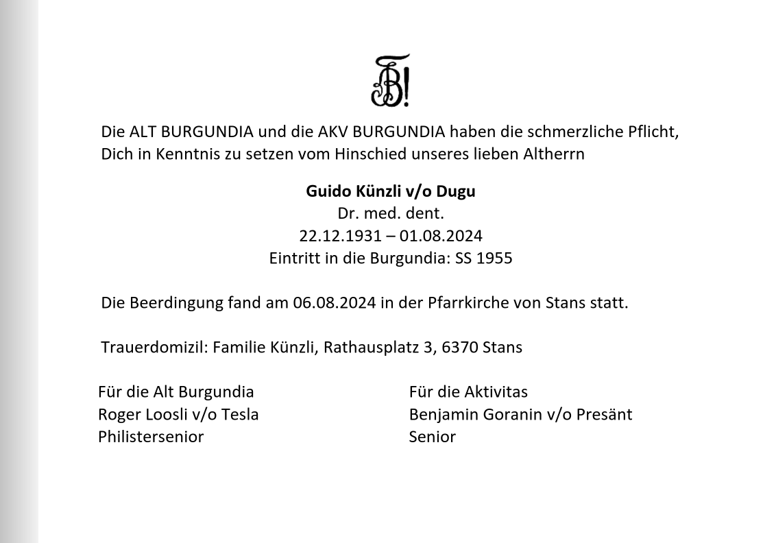Unser lieber AH Guido Künzli v/o Dugu ist am 1. August 2024 verstorben.