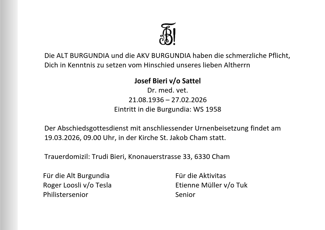 Unser lieber AH Josef Bieri v/o Sattel ist am 27. Februar 2026 verstorben.